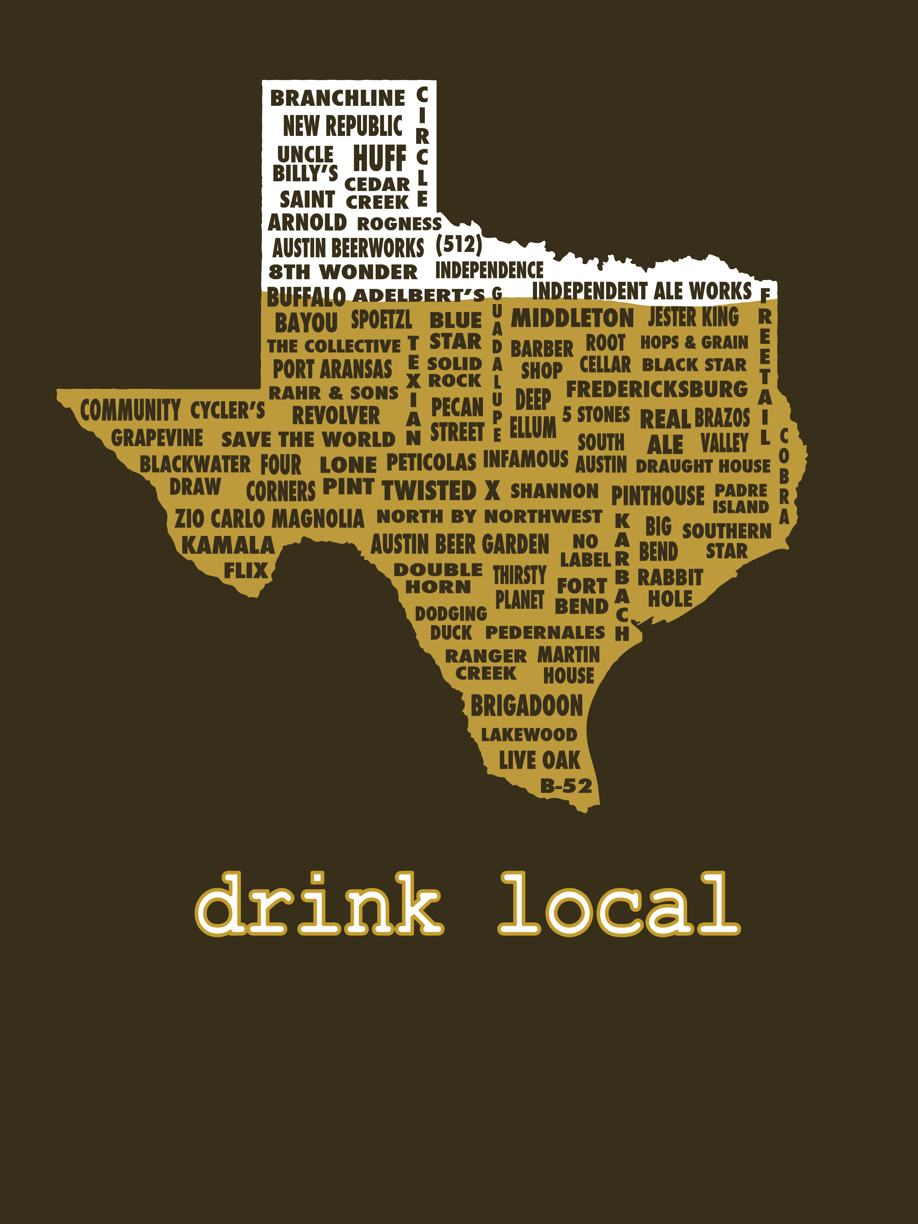 These Drink Local TX Shirt include all the members of the Texas Craft Brewers Association on a map of Texas. Shirts are 100% Ring-spun Cotton and softer than the foam on a nitro java porter.