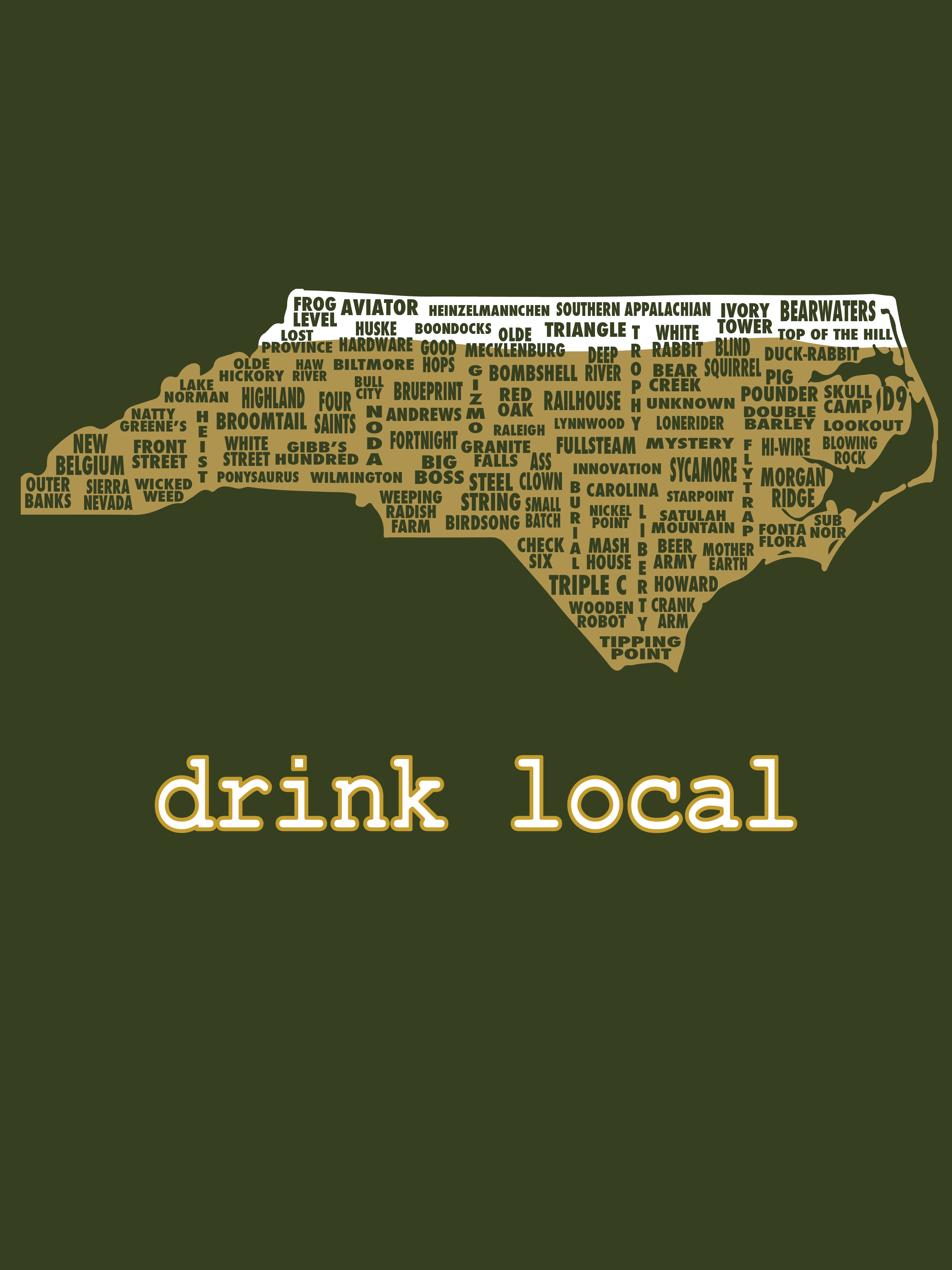 These Drink Local NC Shirt include all the members of the North Carolina Brewers' Guild on a map of North Carolina. Shirts are 100% Ring-spun Cotton and softer than the foam on a nitro java porter.