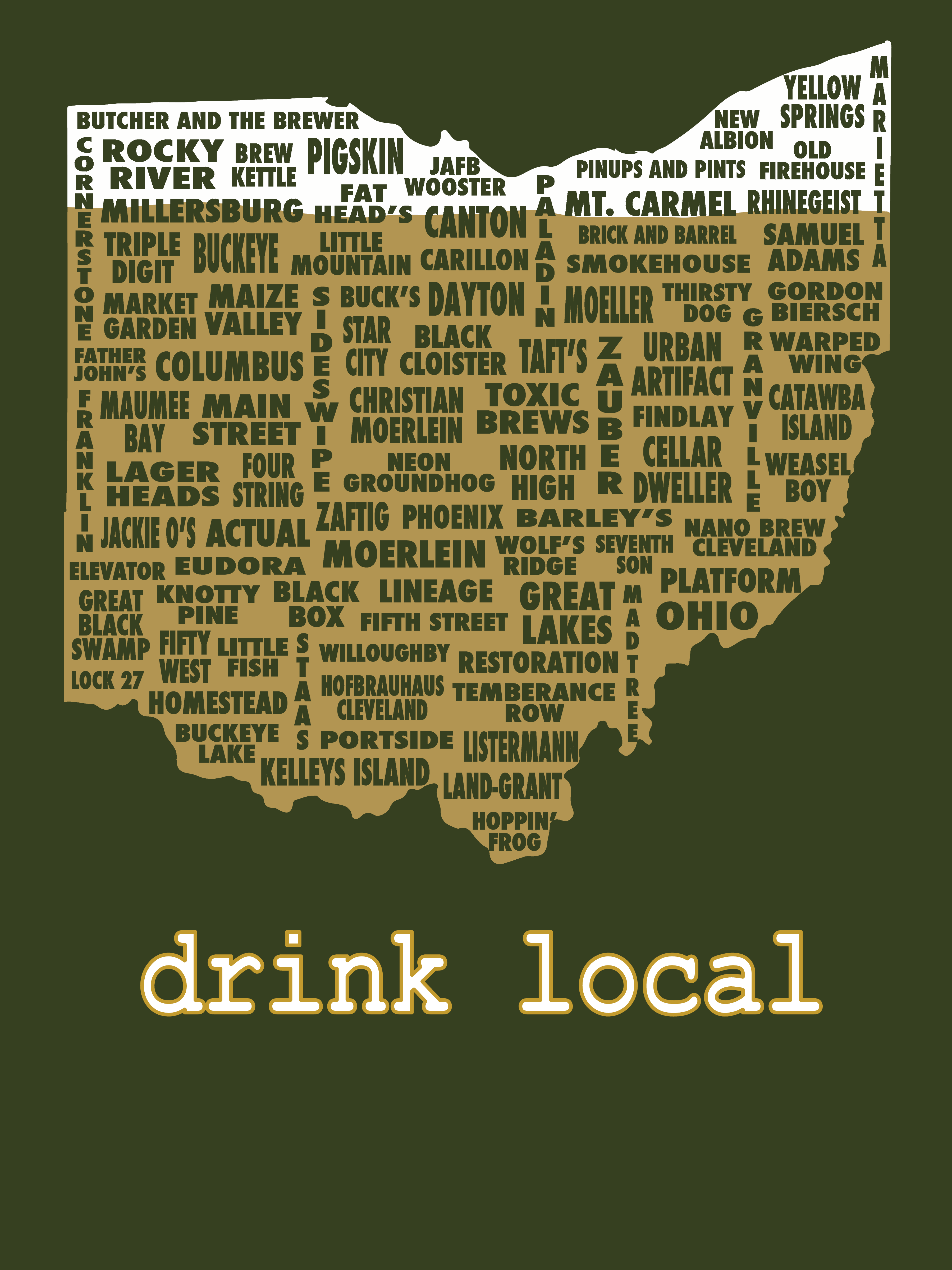 These Drink Local OH Shirt include all the members of the Ohio Brewers on a map of Ohio. Shirts are 100% Ring-spun Cotton and softer than the foam on a nitro java porter.
